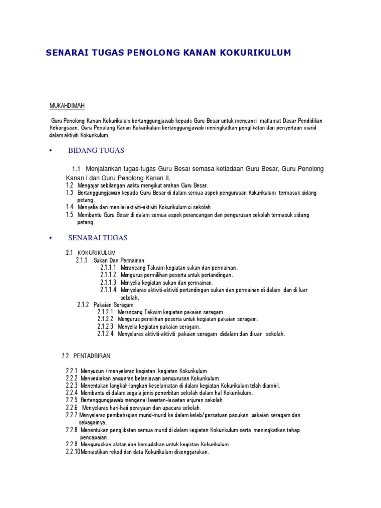Sebelum ini dengar-dengar dari jauh nak isi pun bertangguh sebab nak tunggu taklimat daripada guru yang ditugaskan. SENARAI TUGAS GURU PENOLONG KANAN KOKURIKULUM 10 Bidang Tugas 11 Menjalankan tugas-tugas Pengetua semasa ketiadaan Pengetua Penolong Kanan dan Penolong Kanan HEM. Meguruskan hal ehwal kebajikan murid yang memerlukan bantuan seperti.