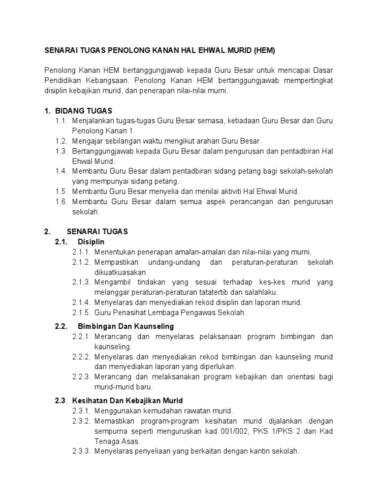 Senarai Tugas Penolong Kanan Hal Ehwal Murid Sekolah Menengah Mukadimah Penolong Kanan Hal-Ehwal Murid bertanggungjawab kepada Pengetua untuk mencapai Dasar Pendidikan Kebangsaan. Bertanggungjawab kepada Guru Besar dalam hal-hal kaunseling keselamatan dan kebajikan pelajar buku teks penerbitan dan percetakan perayaan sekolah. Atas dasar inilah matlamat dan objektif pengurusan HEM bertunjang kepada disiplin kebajikan keselamatan serta melestarikan amala-amalan baik yang berkualiti sehingga mampu memberi sumbangan.